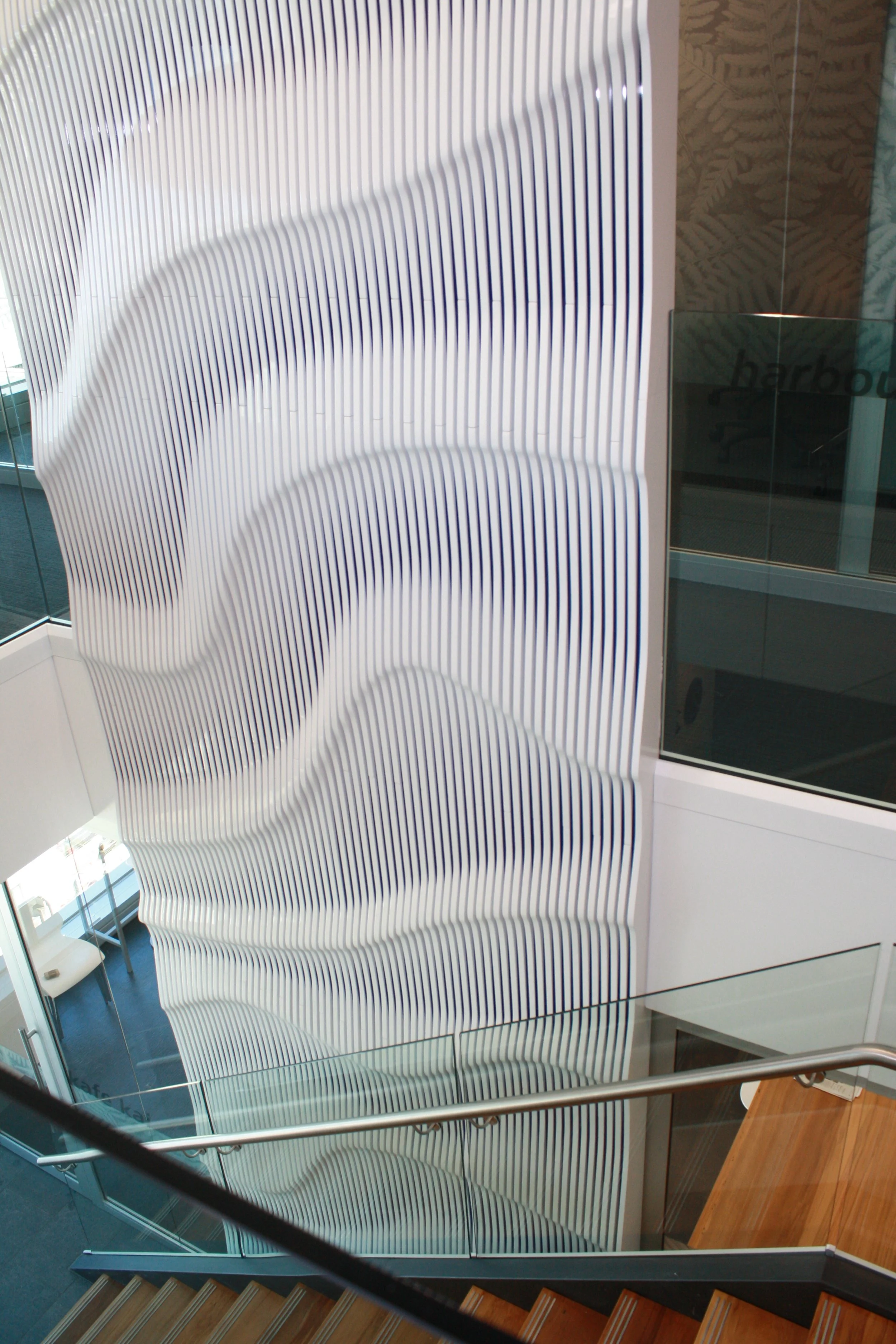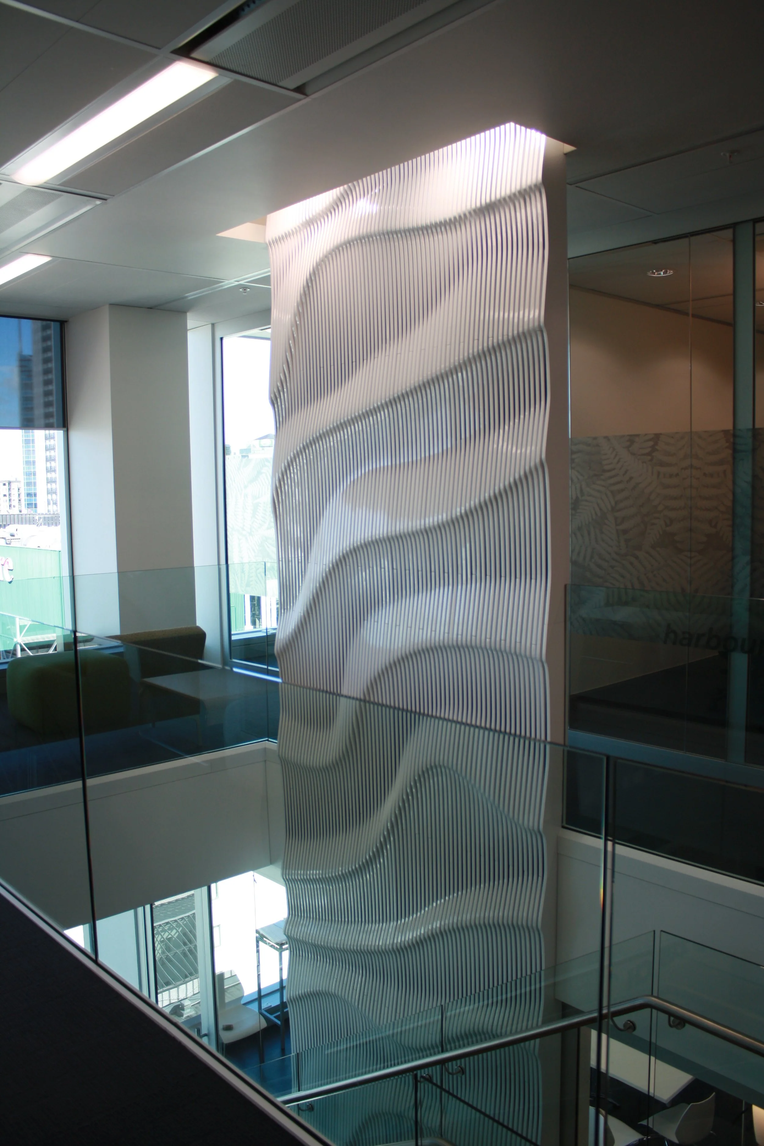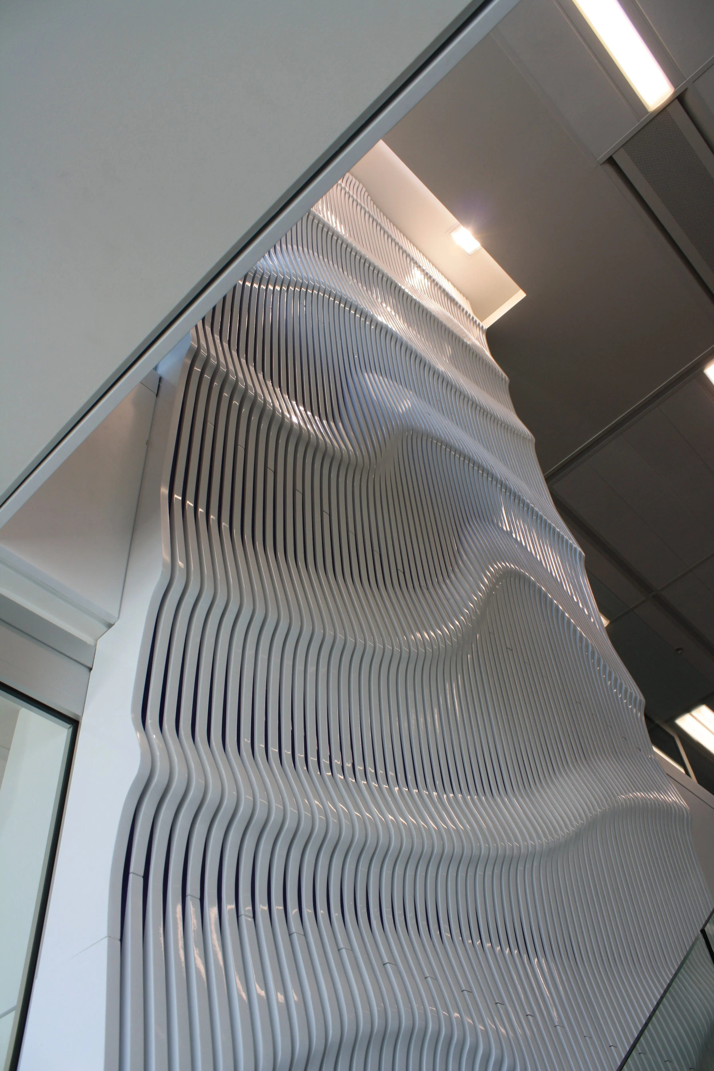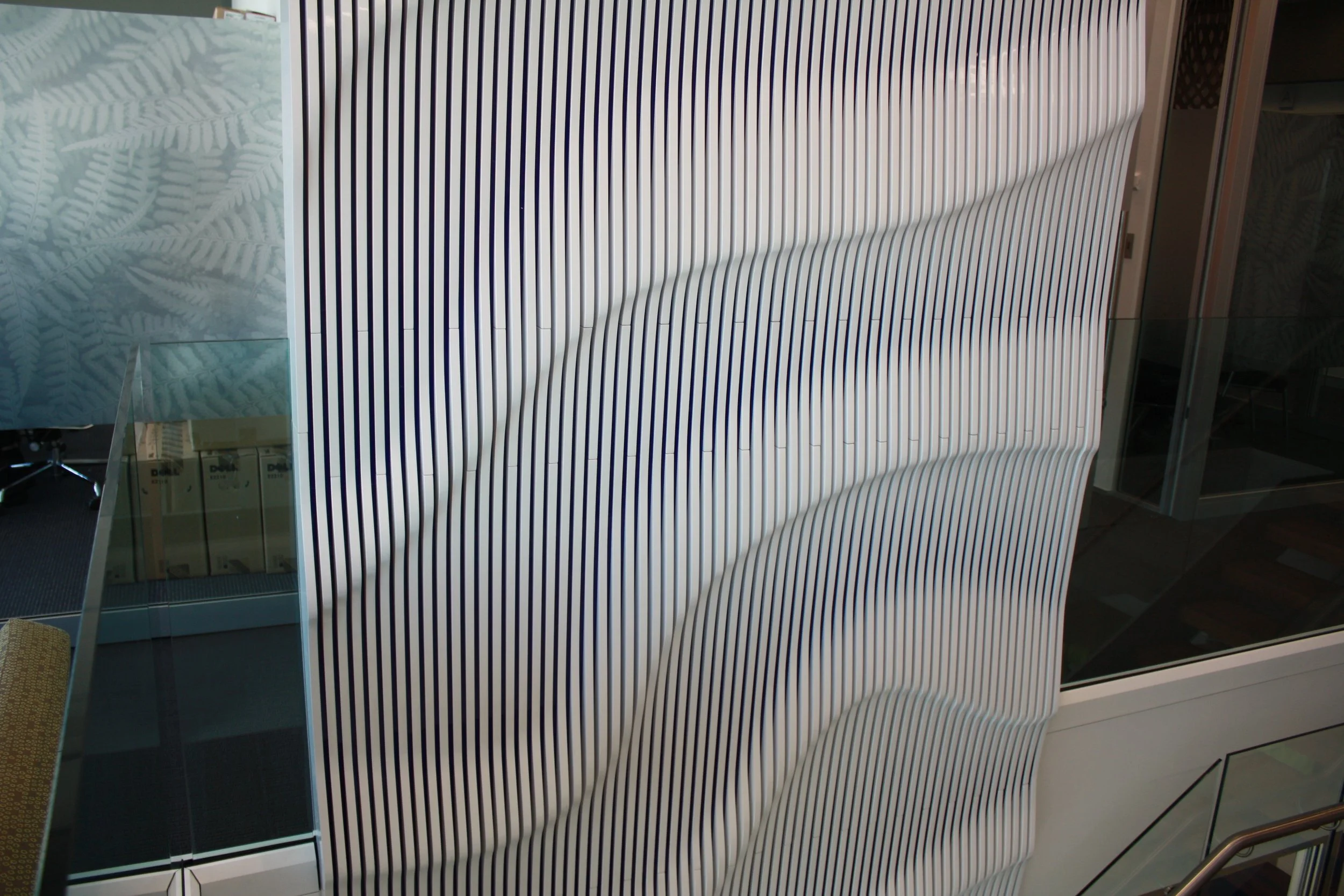 Behold the monumental bespoke feature wall spanning three floors within Auckland City's Zurich building. Crafted with precision, custom parts intricately joined together form a mesmerizing 3D design tailored exclusively for Zurich. Finished in a pristine white high gloss paint, this striking feature commands attention upon entry, leaving an indelible impression on all who encounter it. A testament to both craftsmanship and innovation, it stands as a defining element of the building's architectural landscape