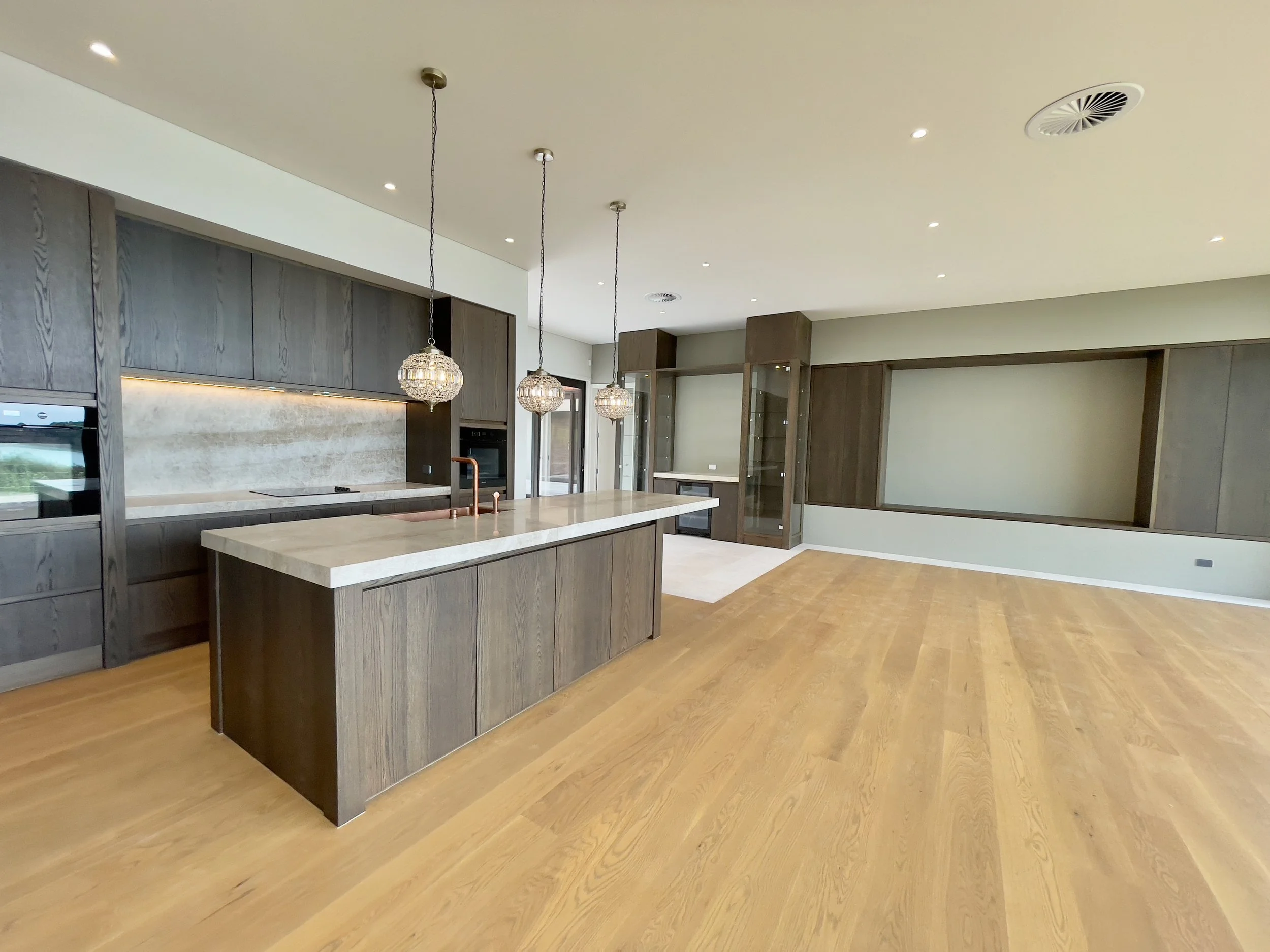 Indulge in the epitome of luxury with our large high-end kitchen, meticulously designed to captivate the senses. Featuring sleek shark nose handles, the kitchen boasts thick marble benchtops that exude opulence in both the kitchen, pantry, and bathrooms. Recessed to accommodate a magnificent brass sink and cooktop, every detail speaks to the pursuit of perfection.