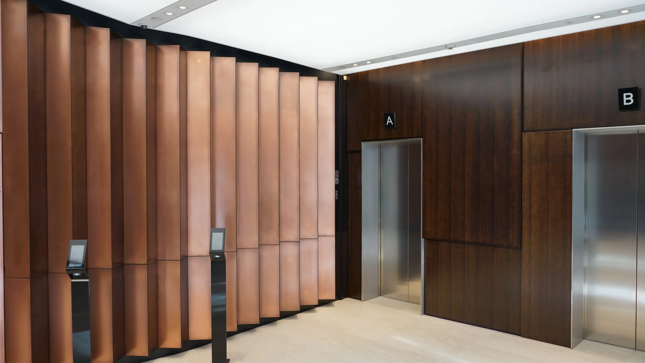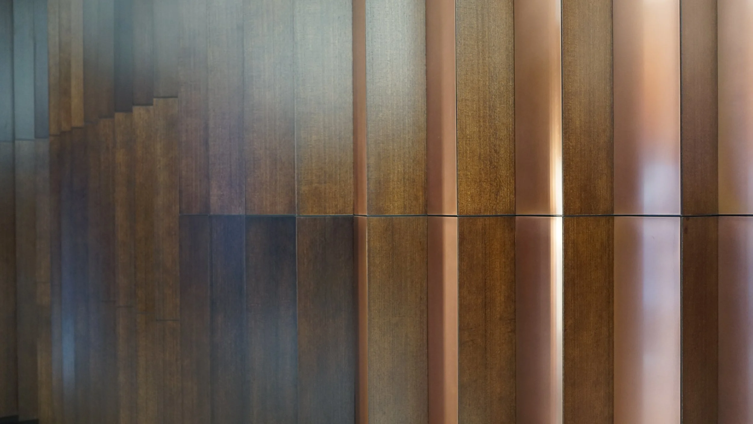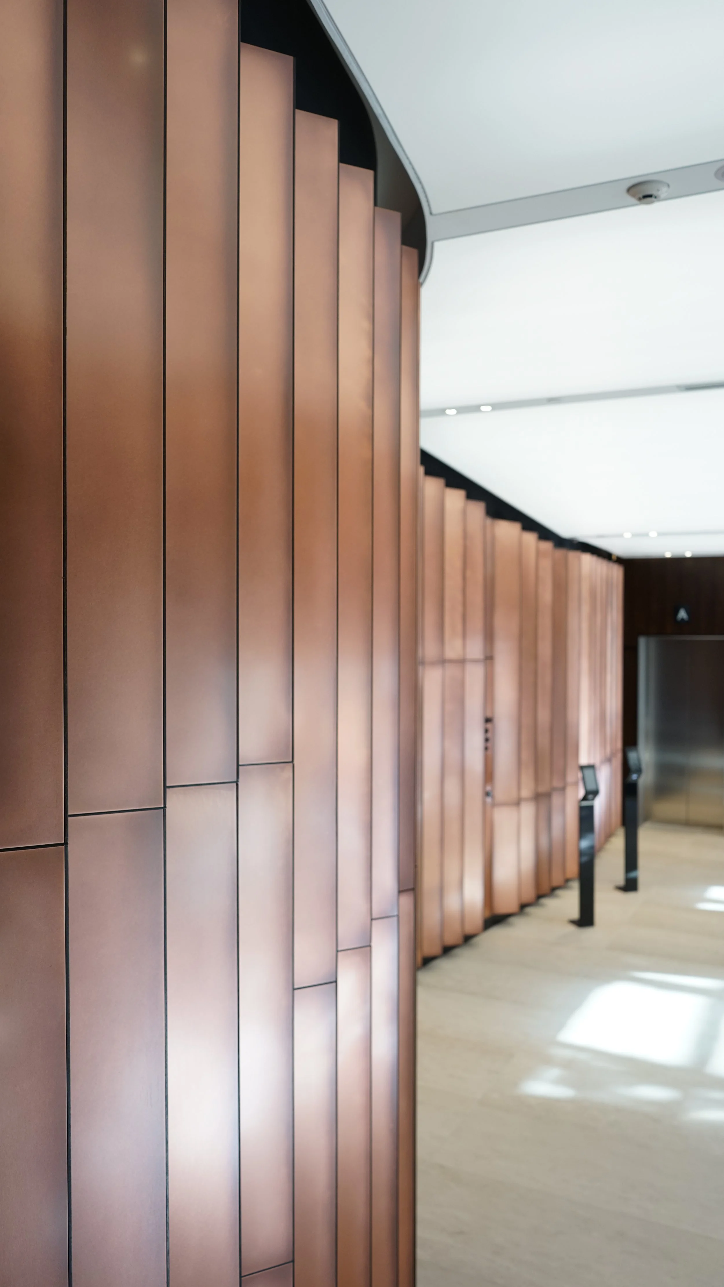 Behold the bespoke wall paneling adorning the prestigious Lumley Center in Auckland City, setting a new standard for architectural excellence in one of the CBD's premium commercial buildings. Crafted to perfection, custom-made copper panels, backed with solid oak timber, create an unmistakable statement piece that captivates all who enter.